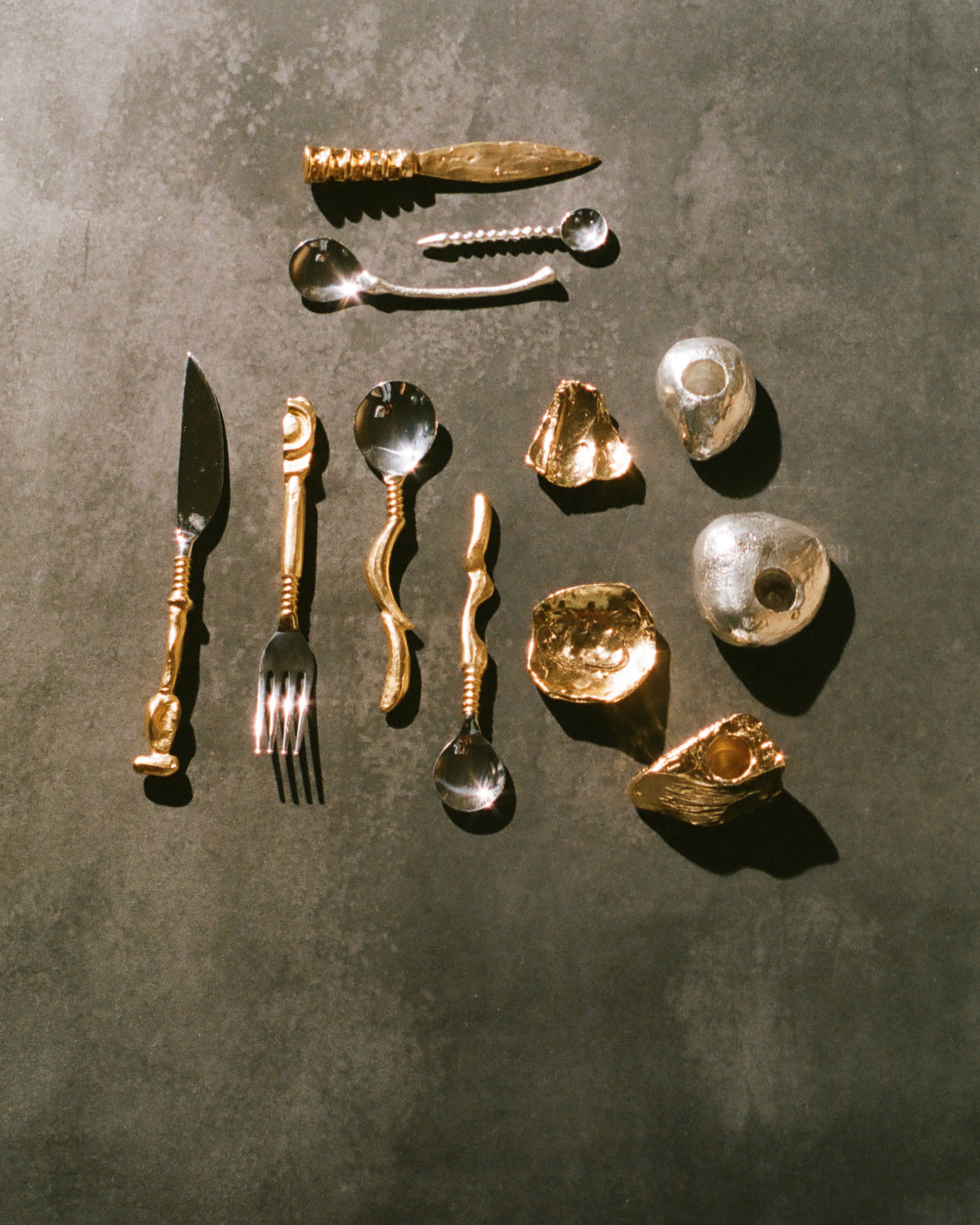 Danish designer Arje Griegst once rejected the cool minimalism expected of Scandinavian design, choosing instead biomorphic, rebellious forms that symbolised growth and life. Contemporary jewellers continue that spirit. Gala Colivet Dennison reshapes spoons from fragments of other objects, balancing function with poetic impracticality. Rosh Mahtani’s Alighieri Casa casts tactile brass pieces that feel ancient, grounding the act of eating in ritual. Orit Elhanati embeds dark stones into gold-plated utensils, turning a casual meal into an event. Laila Gohar elevates tablescapes into dreamlike installations, blurring the boundary between nourishment and fantasy.