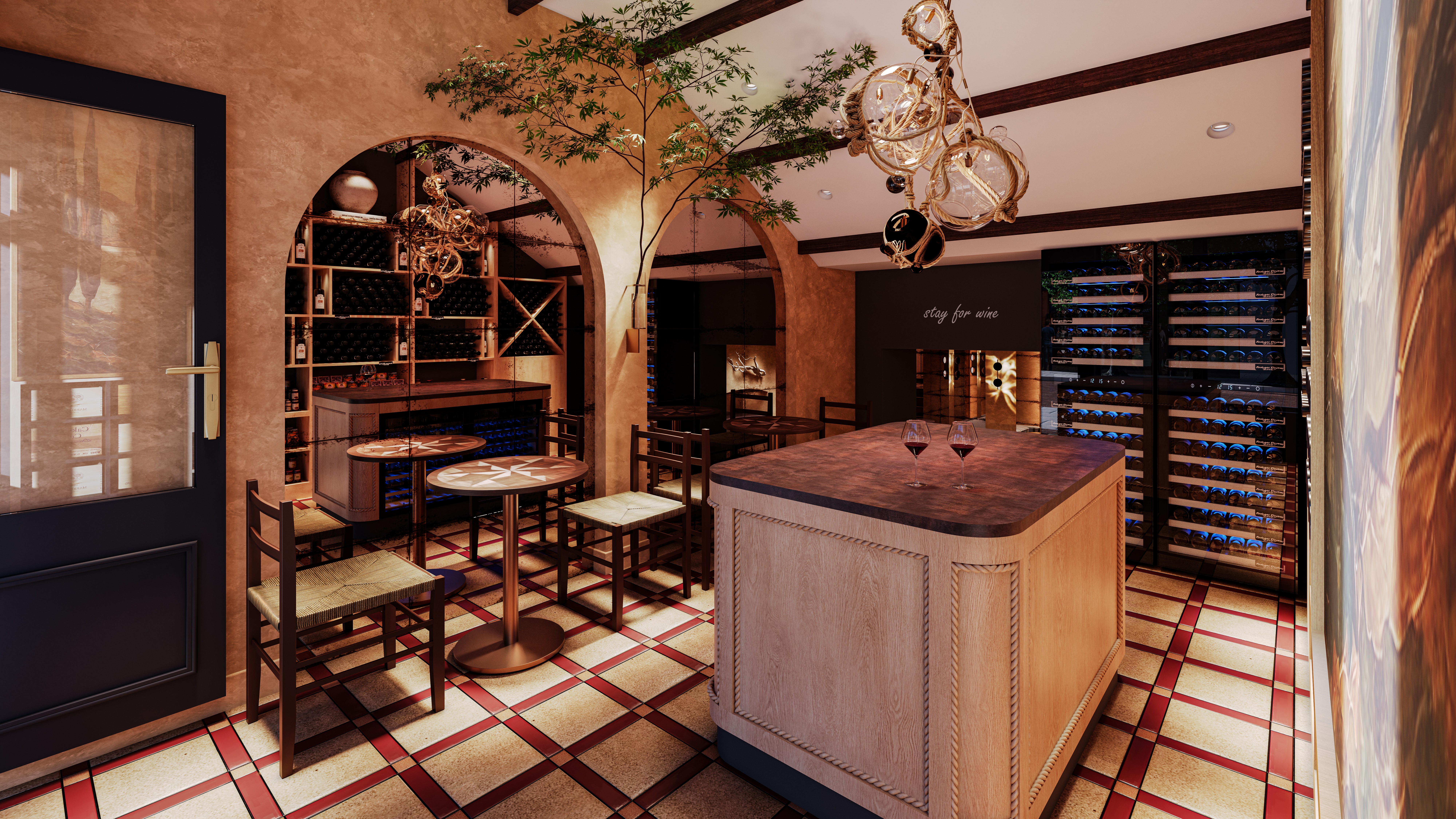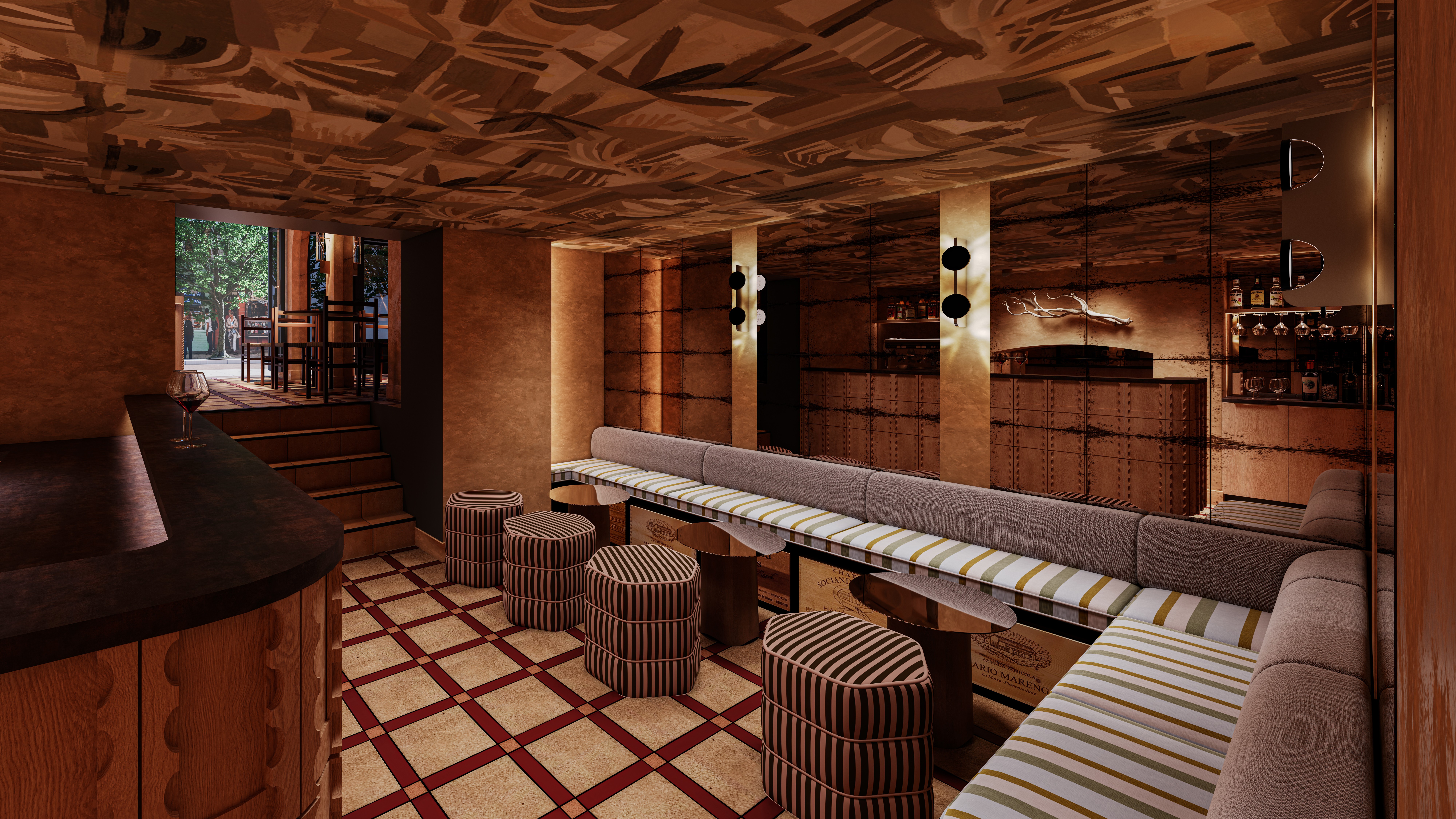 A palette drawn from natural cork tones grounds the interior in warm, earthy hues that echo the wines on display. Upholstery, textured wall coverings, and ceiling treatments introduce subtle outdoor references a suggestion of a Tuscan courtyard brought indoors. The bar joinery reads as domestic furniture, allowing guests to witness the serving ritual while maintaining a relaxed, residential character.
